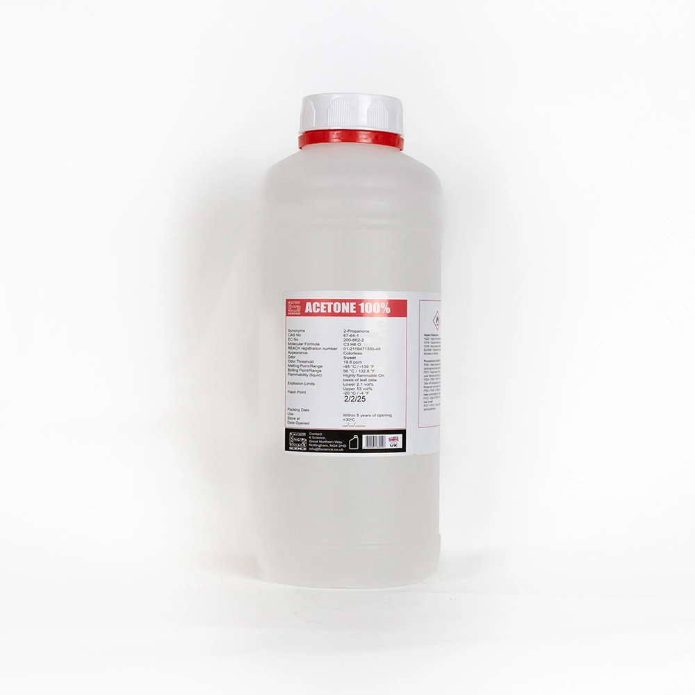 Our 100% acetone is quality Anhydrous and has a wide range of uses. Acetone is colourless, volatile, flammable liquid and is the simplest and smallest ketone. Acetone is miscible with water and serves as an incredibly important solvent in it’s own right. Acetone is typically used for cleaning laboratories. Acetone is a common building block in organic chemistry. Familiar household uses of acetone are as the active ingredient in nail polish remover and as paint thinner.